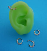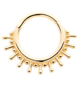 This 14kt gold segment ring will make a lovely addition to your septum or cartilage jewelry collection. It features a 5/16" (8mm) inner diameter and is available in 18G or 16G sizes. The design is made up of a beaded sun burst design. The hinged design makes it easy to open and click closed.
