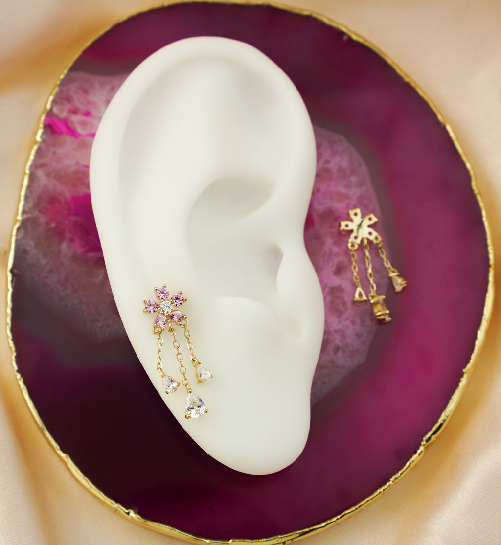 This threadless top piece has single, beaded flower design on top that is filled pink and clear cubic zirconia gems. Attached are three, dangling, teardrop, clear cz gems. The full design measures around 7mm x 6.7mm with 10mm and 15mm dangling lengths. This jewelry piece is made with 14kt nickel-free yellow gold and a 316LVM ASTM F-138 5mm stainless steel pin. Inspired by Japan's lovely cherry blossoms. Shimmering jewelry choice for a variety of ear piercings! Sold individually (1pc).