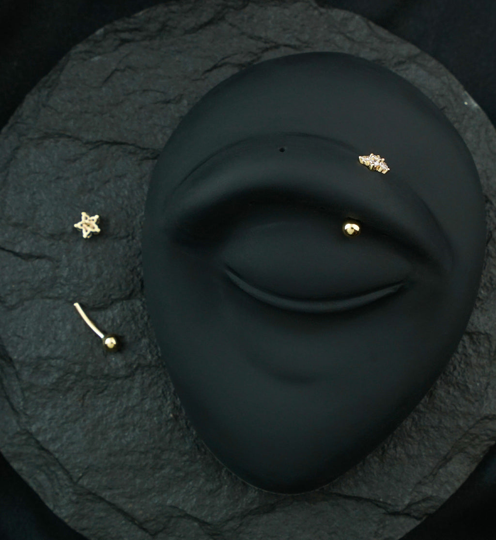 Curved barbells decorated with a flower design on top that is filled with round, clear cz gems. The top piece has a threadless design that makes it easy to put in and take out. The top design measures 5mm. Made from 14kt yellow gold with an inner length of 5/16" (8mm) and a 16G size. Complete with a 3mm ball on the bottom. Sold individually. Fun jewelry piece for your eyebrow or rook piercings!