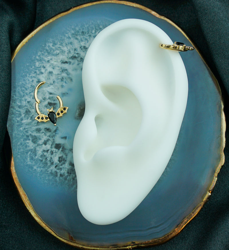 Spooky 14kt gold hinged segment ring that has a flying bat design that has a teardrop, black cz gem as the body of the bat. The wings are accented with black cz gems as well. Made from high quality 14kt gold. Hinged style makes for easy to insert and remove. Size is 16G with an inner diameter size of 5/16" (8mm). Sold individually (1pc).