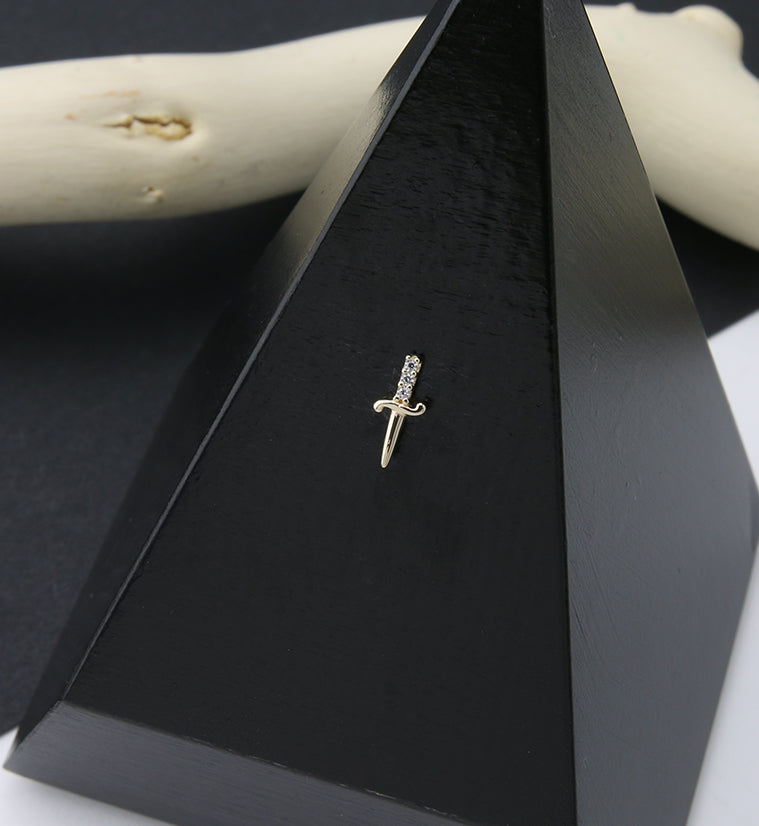 14kt nickel-free gold dagger threadless top piece with sparkling cz gems. 316LVM ASTM F-138 stainless steel pin. Sized at 8mm x 3.7mm. Sold individually (1 piece - top only).