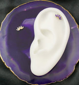 Threadless top piece that has an arched design that is filled with five, amethyst purple marquise cz gems. Fits all threadless posts. Made from 14kt nickel-free yellow gold with a 316L stainless steel pin. Pin size is 25G. Length is approximately 5mm. Top size measures around 8.5mm x 4.5mm. Sold individually (top only).