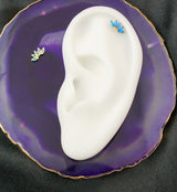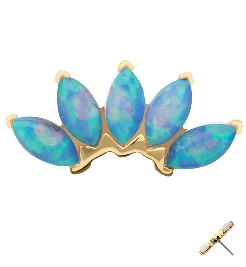 Beautiful, threadless top piece that has an arched design that is filled with five, synthetic, blue opalite marquise gems. Fits all threadless posts. Made from 14kt nickel-free gold with a durable 316L stainless steel pin. Pin size is 25G. Length is approximately 5mm. Top size measures around 8.5mm x 4.5mm. Sold individually (1pc-top only).