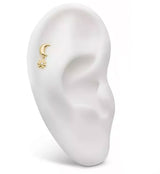 Threadless top piece that has a crescent moon design that has an attached, 5mm dangling star with a clear cz gem in the middle. Fits all threadless posts. Made from 14kt nickel-free gold with a 316L stainless steel pin. Top size: 12mm x 2.5mm. Pin size is 25G. Pin length is approximately 5mm. Sold individually (1pc, top only).