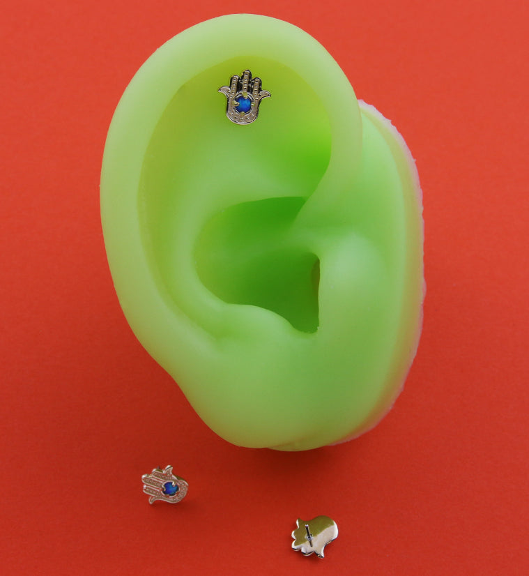 Beautiful threadless top piece that has a hamsa hand design and a centered, synthetic, blue opal gem and a beaded texture. Fits all threadless posts. Made from 14kt nickel-free gold with a 316LVM ASTM F-138 implant grade steel pin. Length is approximately 5mm. Top size: 7.7mm x 7.5mm. Sold individually (1pc, top only).
