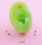 This 14kt gold heart labret is a stylish choice for your piercing. It features a 4mm synthetic white opal gem and is sold individually as two pieces - top and bottom - for your convenience. It's available in both 18G and 16G gauges, with a 5/16" length and a 3mm disk size. The threadless design provides secure closure with an elegant look.