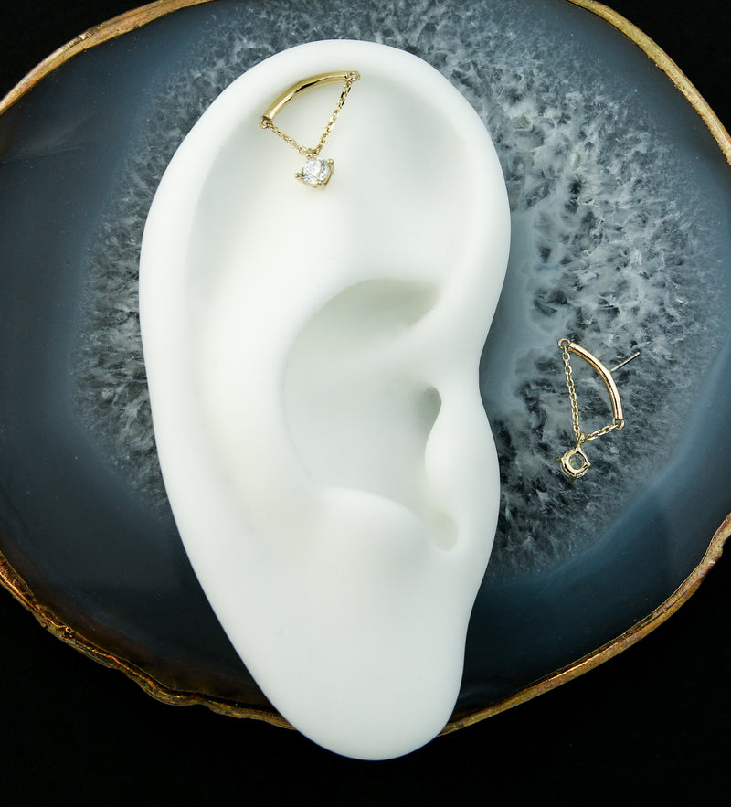 Made with nickel-free 14kt gold and a 316L stainless steel pin, this cool 11.5mm x 2.2mm (dangle: 11mm) top features a secure 25G pin fit for most threadless posts. This piece has a curved bar design that can appear to be hidden depending on what piercing you use it for. Add it to your helix piercing and have just the dangling clear cz showing! Sold individually.