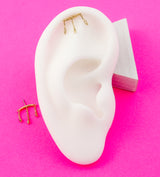 Made with nickel-free 14kt gold and a 316L stainless steel pin, this cool 10mm x 2.2mm (dangles: 6mm, 10mm, 6mm) top features a secure 25G pin fit for most threadless posts. This piece has a curved bar design that can appear to be hidden depending on what piercing you use it for. Add it to your helix piercing and have just the dangling chains and spikes showing! Sold individually (top only).