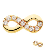 Threadless top piece that has an infinity design with a row of sparkling, clear cz gems. Fits all threadless posts. Made from 14kt nickel-free gold with a 316L stainless steel pin. Pin size is 25G. Length is approximately 6mm. Top size is about 9mm x 4mm. Sold individually (1pc, top only).