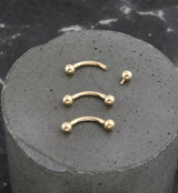 This golden curved barbell is crafted from 14kt nickel-free gold and is size 16G with either a 5/16" (8mm) or 3/8" (10mm) length and 3mm ball ends. One ball is internally threaded while the other is fixed. Sold individually (1pc).