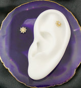 Threadless top piece that has a flower shape that has an interweaved design and is accented with clear cz gems. Made from 14kt nickel-free gold with a 316L stainless steel pin. Pin size is 25G. Length is approximately 5mm. Top size measures at 7.5mm x 7.5mm. Sold individually (1pc-top only).