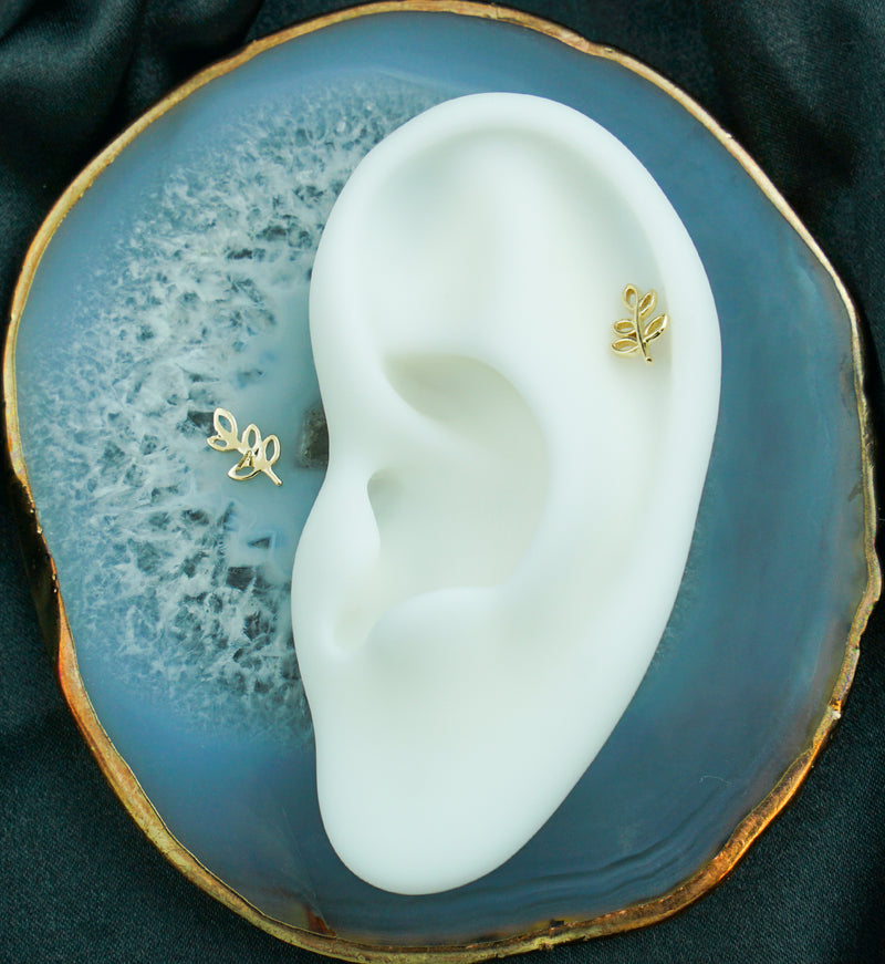 14kt nickel-free gold threadless top piece that has an outline of a leaf design. Pin size is 25G and fits most threadless posts. The size is about 10mm x 6mm. Fun top to add to your cartilage or tragus piercing! Sold individually (top only).
