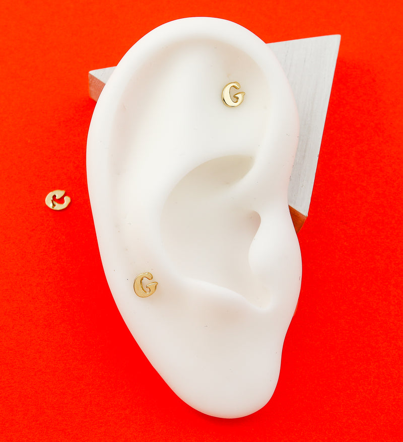Threadless letter "G" top piece. Made from 14kt nickel-free gold with a 316LVM stainless steel pin. Size is approx. 4.9mm x 4.6mm. Sold individually (1pc, top only).