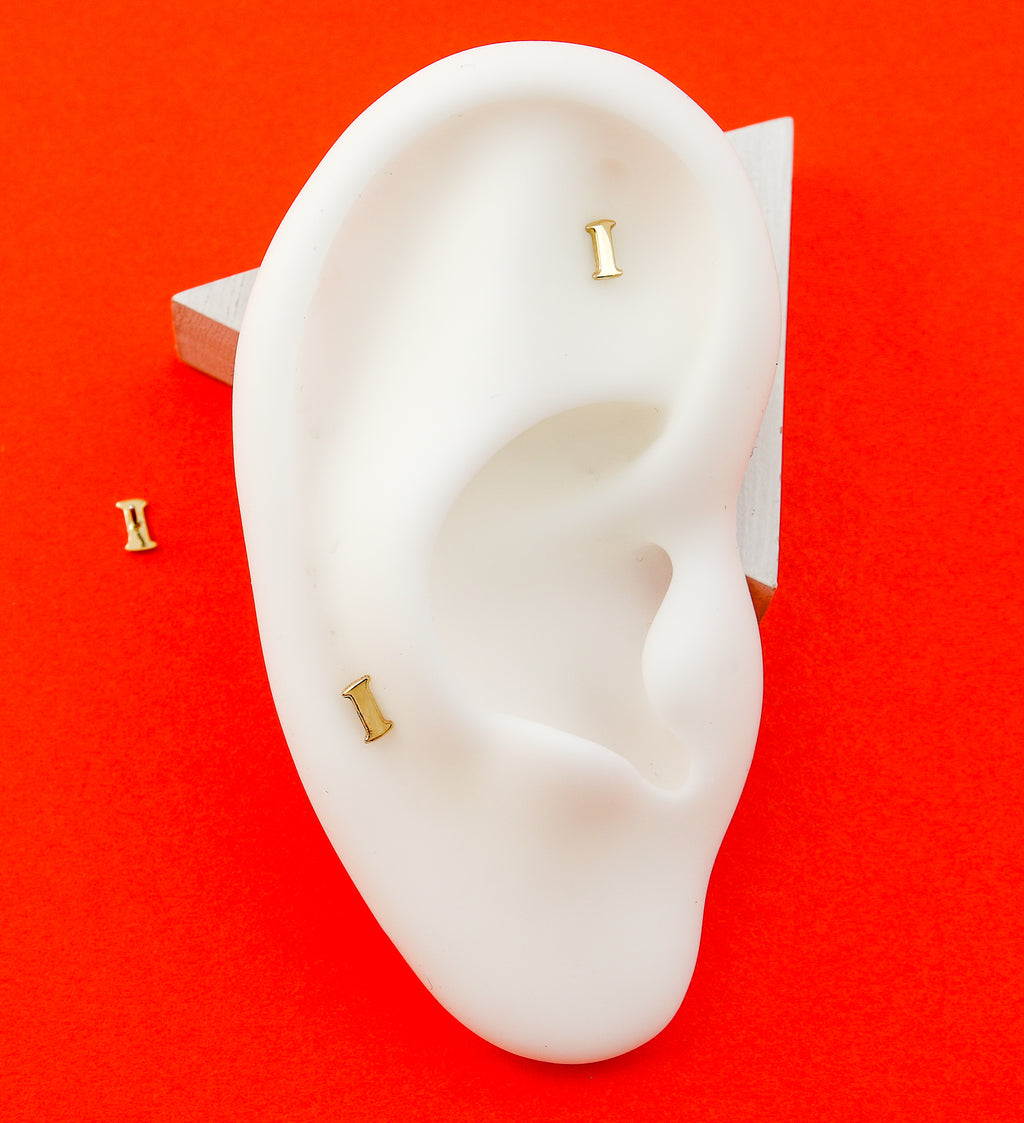 Threadless letter "I" top piece. Made from 14kt nickel-free gold with a 316LVM stainless steel pin. Size is approx. 4.6mm x 3.3mm. Sold individually (1pc, top only).