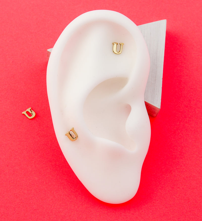 Letter "U" threadless top piece that is made from pretty 14kt nickel-free gold with a 316LVM stainless steel pin. Size is approximately 5mm x 4mm. Sold individually (top only).
