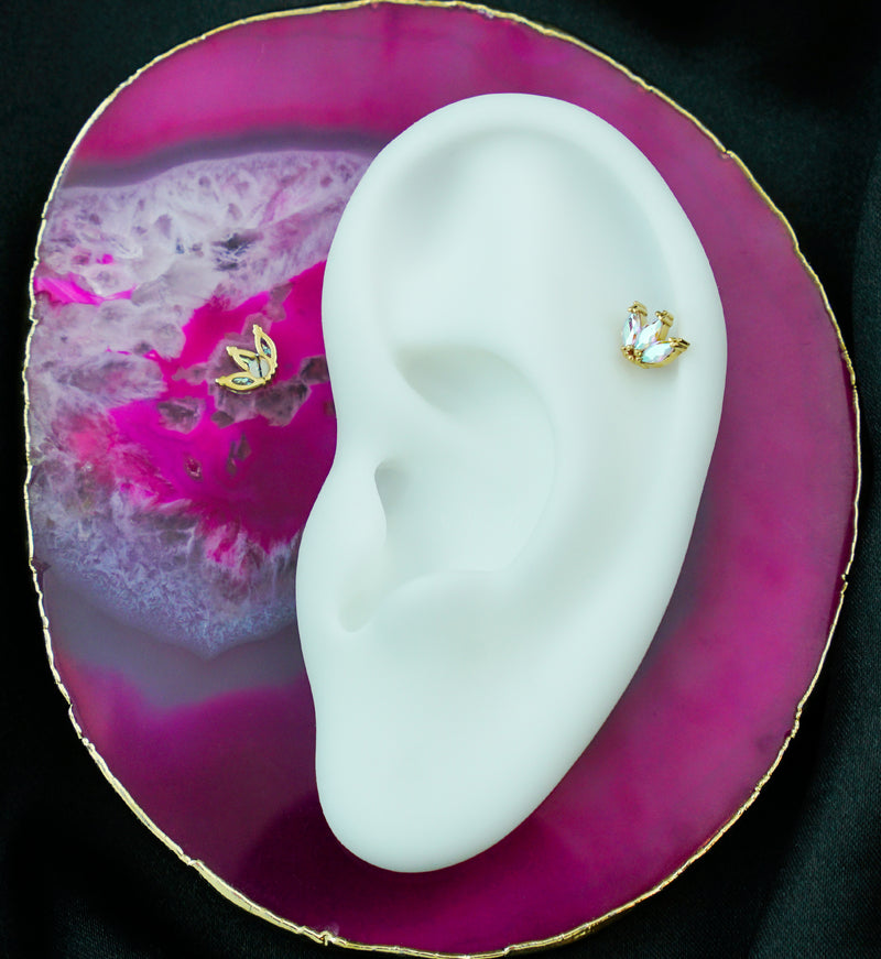 Colorful 14kt gold threadless top piece that is made with three, beaded, marquise, rainbow aurora cz gems. Complete with a 316LVM ASTM F-138 surgical stainless steel pin. Sized at 7.2mm x 5.7mm. Cute threadless choice to add to your ear piercings! Sold individually.