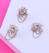 Pretty threadless top piece that has a lotus flower design that is accented with a teardrop, clear cz gem and two-tier, dangling chains. Fits all threadless posts. Made from 14kt nickel-free gold with a 316LVM ASTM F-138 implant grade steel pin. Length is approximately 5mm. Top size measures about 10mm x 9.5mm, dangles are 4mm, 8mm. Sold individually (1pc, top only).