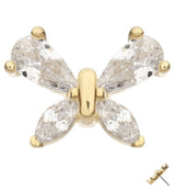 Whimsical 14kt nickel-free yellow gold butterfly threadless top piece that is made with marquise, clear cz gems and 14kt gold. Complete with a 316LVM ASTM F-138 stainless steel pin. Sized at 8.4mm x 6.5mm. Pretty piece to add to your threadless top collection! Sold individually.