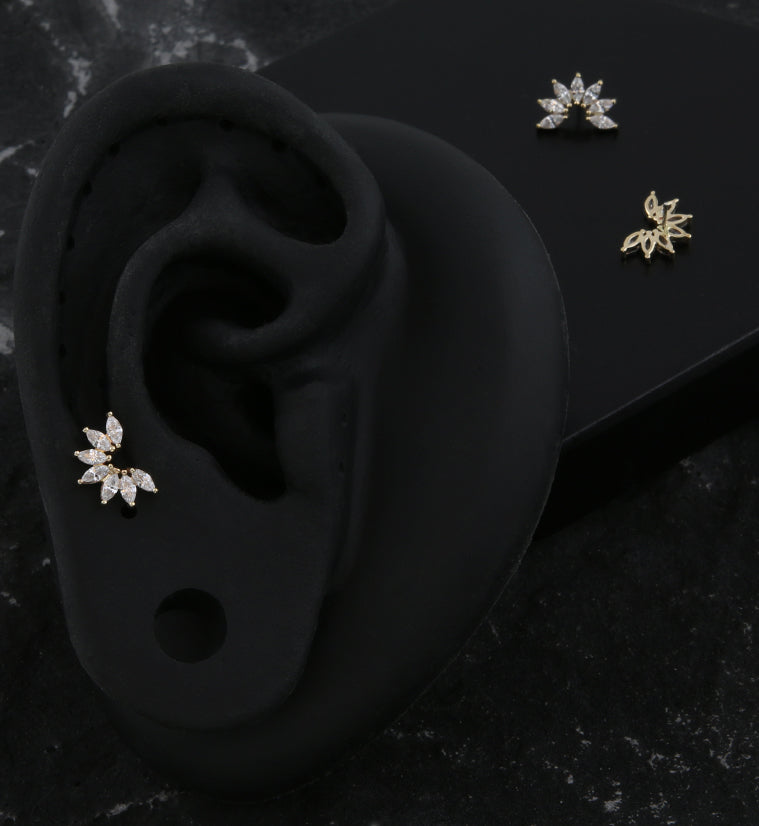 Threadless top piece that has a marquise clear cz gem arch design. Fits all threadless posts. Made from 14kt nickel-free gold with a 316L stainless steel pin. Length is approximately 5mm. Top size: 9.2mm x 6.4mm. Sold individually (1pc, top only).