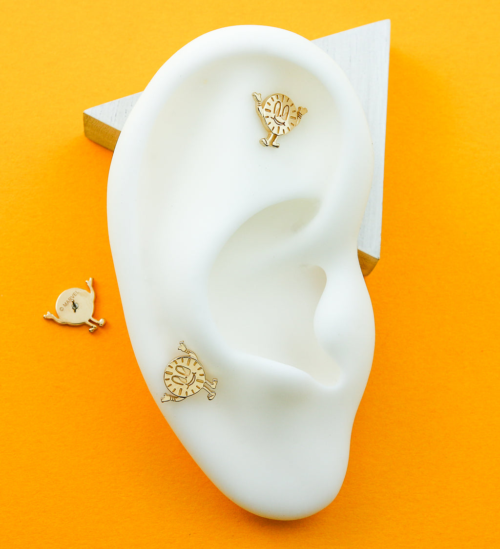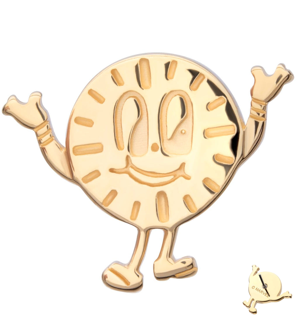 Show your Marvel fandom with this Loki Miss Minutes 14kt gold threadless top piece. Fits all threadless posts. Made from 14kt nickel-free gold with a 316L stainless steel pin. Top size: 10.3mm x 8mm. Pin size is 25G. Pin length is approximately 5mm. Sold individually (top only).