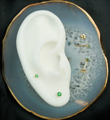 Pretty birthstone stud earrings with a prong set, round, emerald cz gem on the top, the birthstone for May. Made from high-quality 14kt yellow gold with a size of 20G and a length of 1/4" (6mm). Stud design with a butterfly back. Choose your gem size from 2mm or 3mm! Sold in pairs (2pcs).