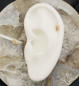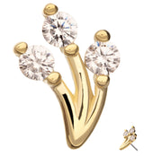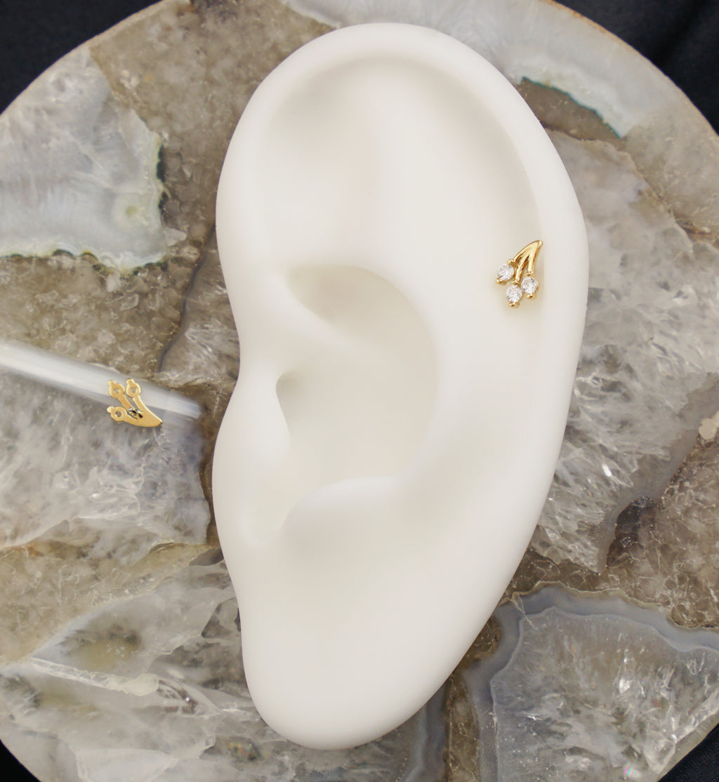 14kt nickel-free gold threadless top piece that has a triple clear cz gem design that resembles a meteor shower or several shooting stars. Pin size is 25G and fits most threadless posts. The size is about 7.5mm x 5.5mm. Sparkly top to add to your cartilage or tragus piercing! Sold individually (top only).