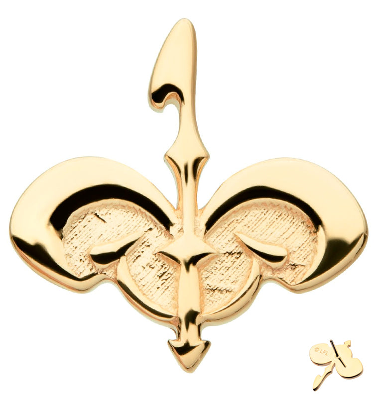 Threadless top piece that has a Star Wars Naboo symbol design. Fits all threadless posts. Made from 14kt nickel-free gold with a 316L stainless steel pin. Top size: 9.5mm x 9mm. Pin size is 25G. Pin length is approximately 5mm. Sold individually (1pc, top only).