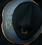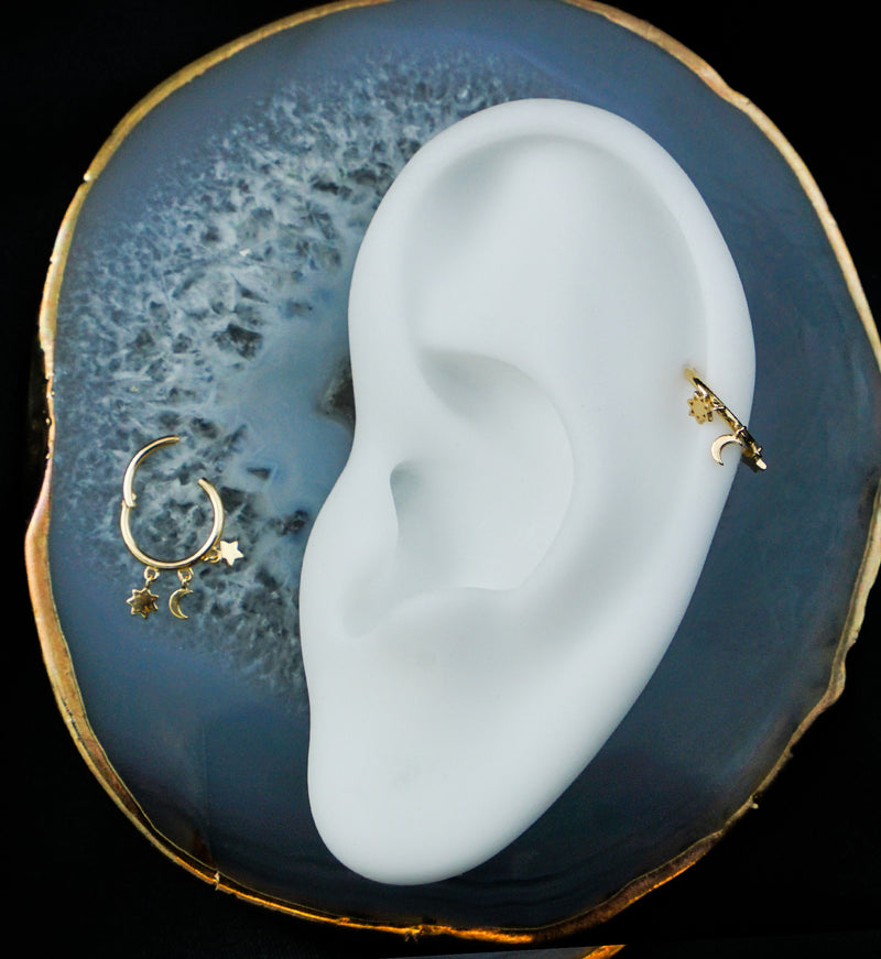 Hinged segment ring that has three dangling charms of a moon and stars. Made from quality 14kt yellow gold. Hinged style makes for easy insertion and removal. Size is 16G with a diameter size of 5/16" (8mm). Sold individually (1pc).