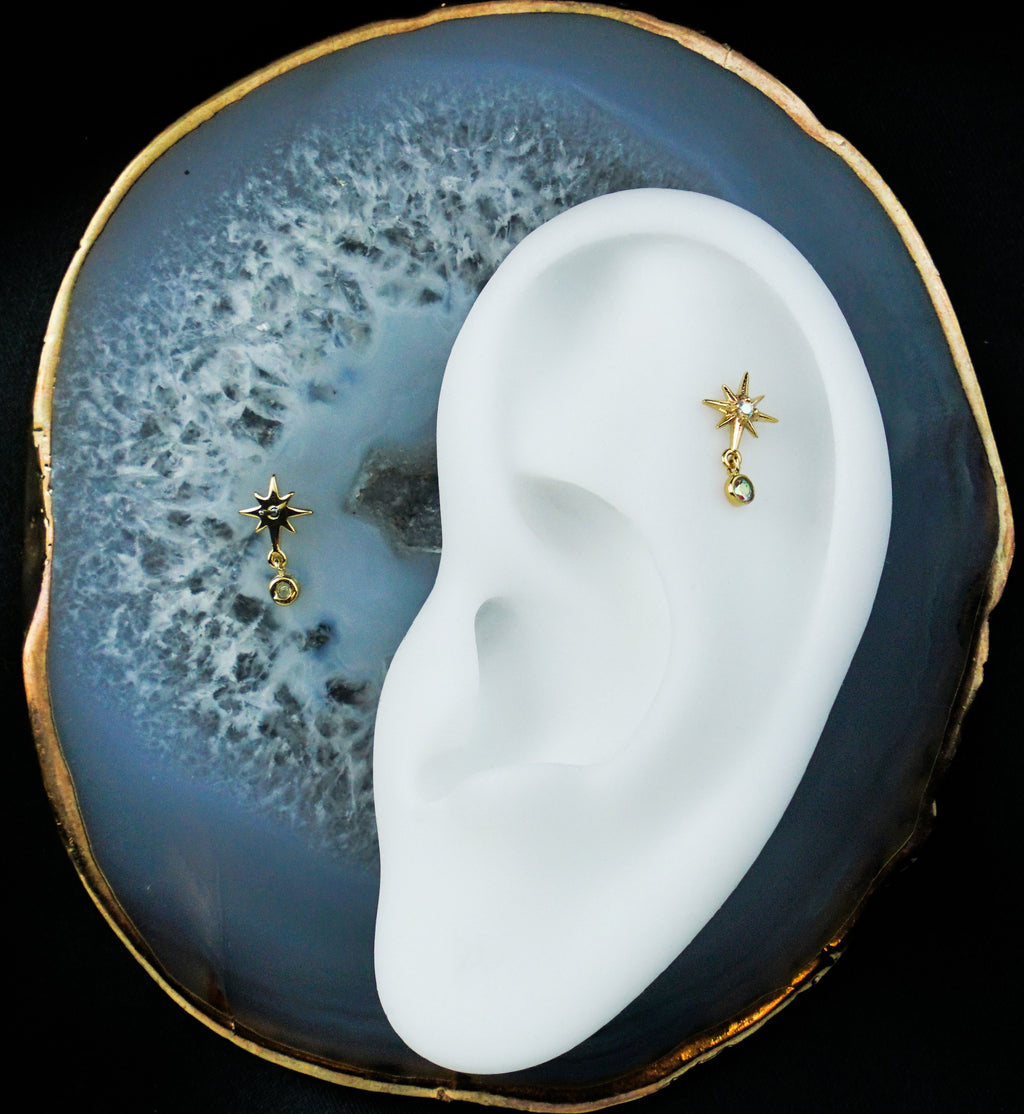 This threadless top piece has a north star design that has a centered rainbow aurora cz gem. The full design measures about 11.5mm x 6.8mm. This jewelry piece is made with 14kt nickel-free gold with a 316LVM ASTM F-138 5mm stainless steel pin. Amazing jewelry piece for a variety of ear piercings! Sold individually (1pc).