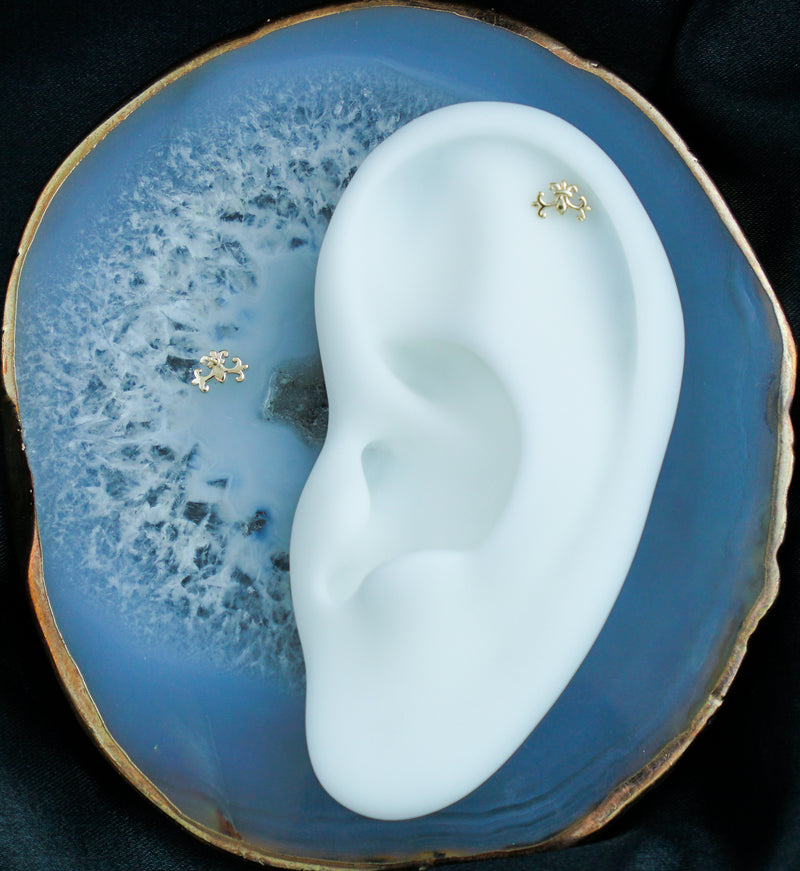 14kt nickel-free yellow gold threadless top piece that has a fleur de lis symbol design. Pin size is 25G and fits most threadless posts. The size is about 7mm x 4mm. Cool piece to add to your threadless top collection! Sold individually.