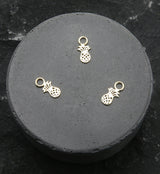 Jewelry charm shaped like a cut-out, pineapple shape. Made from 14kt nickel-free yellow gold. Match this charm with different size hoops and hinged segment clickers for a unique look! Small, versatile piece for a variety of piercings. Great for a curated ear look. O-ring size: 0.8mm (thick) x 2mm (inner diameter) x 3.6mm (outer diameter). Charm size is 8.5mm x 5.5mm. Sold individually (1pc).