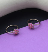 Pretty pink floral hoop ring that is great for nose or cartilage piercings! The annealed (bendable) 14kt gold hoop makes this piece easy to insert and take out. Synthetic pink opalite gems make up the floral design on top. Size is 20G with an inner diameter of 5/16" (8mm). Sold individually. For healed piercings.
