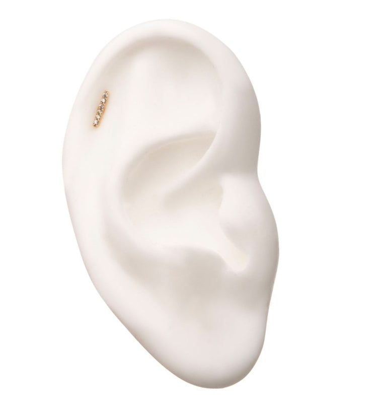Sold individually (1 piece - top only) 14kt gold Threadless Size: 8mm x 1.3mm 316LVM stainless steel pin Designed to fit the barbells/labrets below Threadless Barbell Threadless Labret