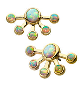 Sold individually (1 piece - top only) 14kt solid gold Threadless Size: 13mm x 8mm 316LVM stainless steel pin Synthetic opalite Designed to fit the barbells/labrets below Threadless Barbell Threadless Labret