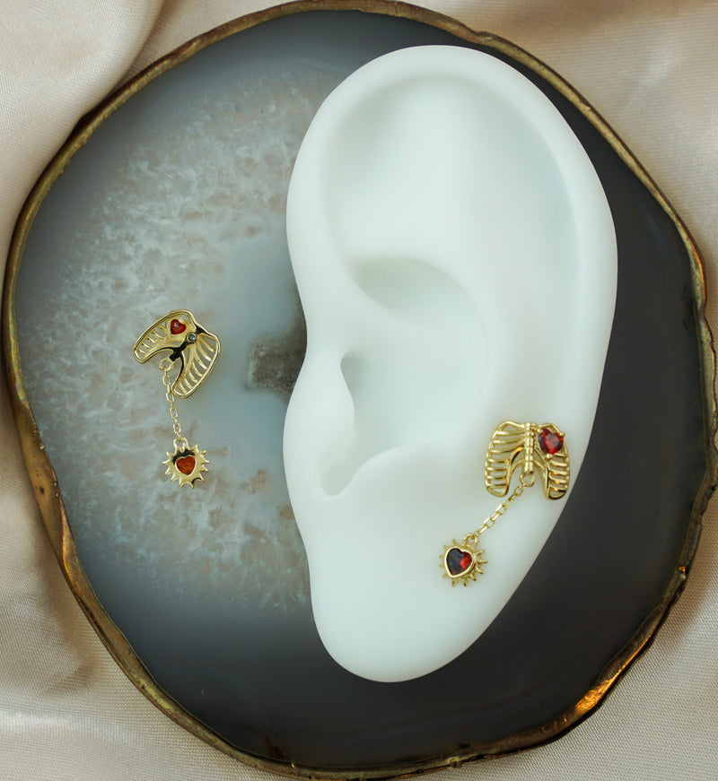 Threadless top piece that has a ribcage design with an accented heart-shape, red cz gem and a dangling, red heart cz that is surrounded with spikes. This jewelry piece is made with 14kt nickel-free gold and a 316LVM ASTM F-138, 5mm stainless steel pin. Edgy threadless jewelry for a variety of ear piercings! Sold individually (1pc - top only).