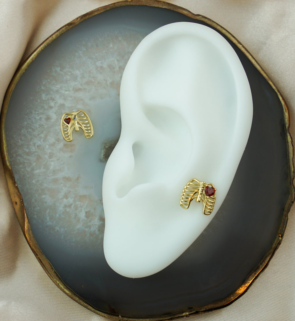 Threadless top piece that has a ribcage design that is accented with heart-shaped, red cz gem. This jewelry piece is made with 14kt nickel-free gold and a 316LVM ASTM F-138, 5mm stainless steel pin. Cool threadless jewelry for a variety of ear piercings! Sold individually (1pc - top only).
