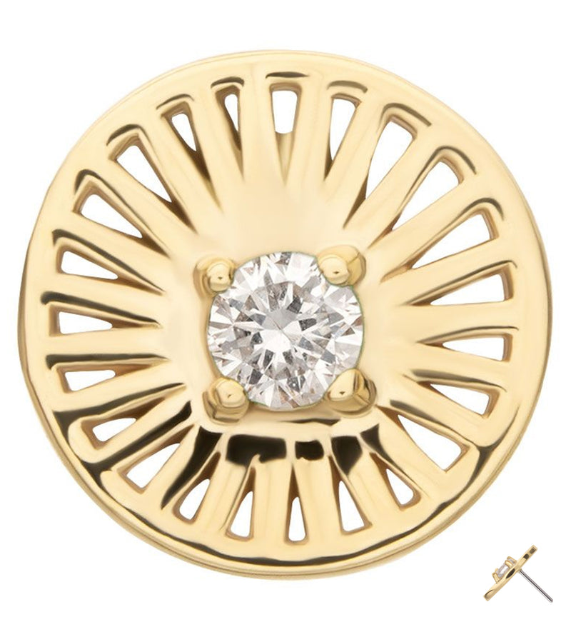 Threadless top piece that has a round shape with a sunburst or sunray design that is radiating out from a round, clear cz gem in the center. Made from 14kt nickel-free gold and a 316L stainless steel pin. Pin size is 25G with a 5mm length. Top size measures 6.9mm x 1.5mm. Sold individually (top only).