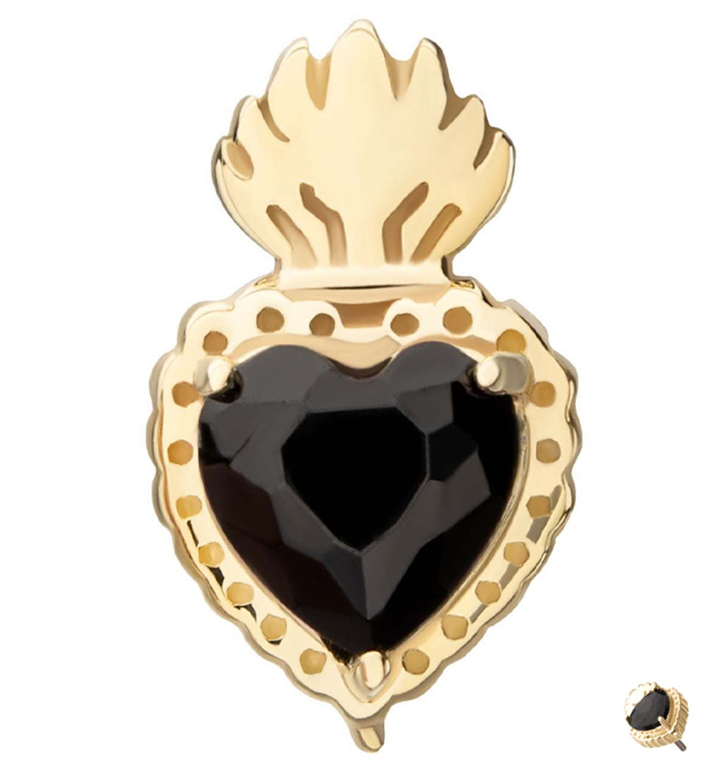 This 14kt Sacred Heart threadless top makes a fun piece of jewelry to curate a look around. Total design measures about 7mm x 4.2mm. Features a 3mm x 3mm black cz heart shaped gem. Top made from 14kt nickel-free gold with a 316LVM ASTM F-138 5mm stainless steel pin. Sold individually (1 piece - top only).