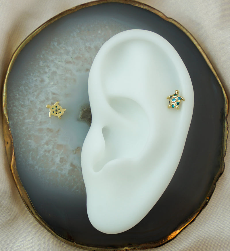 Threadless top piece that has a sea turtle design with accented, aqua cz gems. This jewelry piece is made with 14kt nickel-free gold and a 316LVM ASTM F-138, 5mm stainless steel pin. Oceanic-themed threadless jewelry for a variety of ear piercings! Sold individually (1pc - top only).