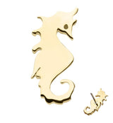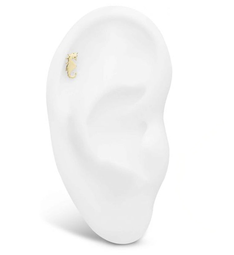 Threadless top piece that has a seahorse design. Fits all threadless posts. Made from 14kt nickel-free gold with a 316L stainless steel pin. Length is approximately 5mm. Top size: 8.2mm x 3.9mm. Sold individually (1pc, top only).