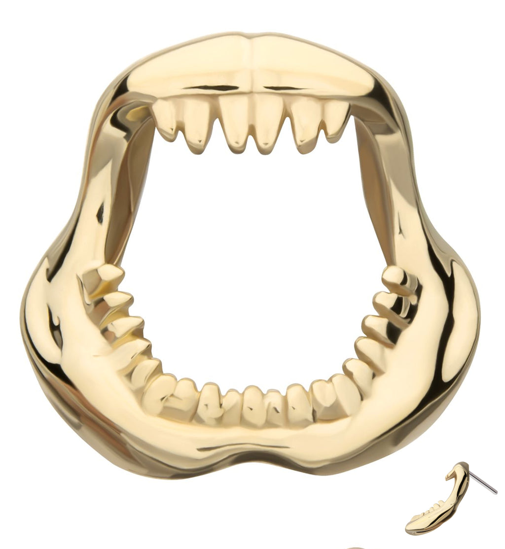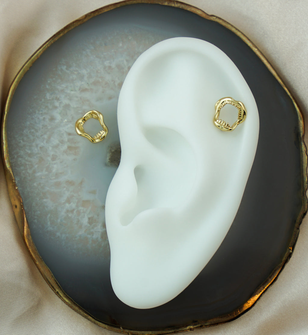 Threadless top piece that has a shark jaw design showcasing lots of shark teeth. This jewelry piece is made with 14kt nickel-free gold and a 316LVM ASTM F-138, 5mm stainless steel pin. Toothy threadless jewelry for a variety of ear piercings! Sold individually (1pc - top only).
