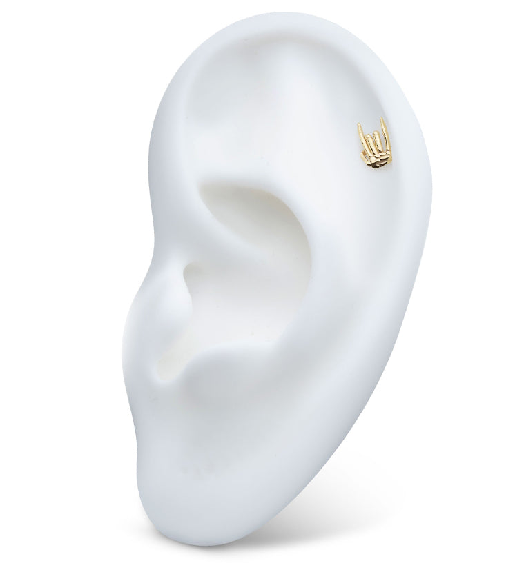 Threadless top piece that has a skeleton hand design in the shape of a "rock on" or "devil's horns" sign. Fits all threadless posts. Made from 14kt nickel-free gold with a 316L stainless steel pin. Length is approximately 5mm. Top size: 8mm x 5mm. Sold individually (1pc, top only).