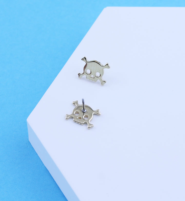 Cool threadless top piece that has skull and crossbones design. Fits all threadless posts. Made from 14kt nickel-free gold with a 316LVM ASTM F-138 implant grade steel pin. Length is approximately 5mm. Top size measures about 7.3mm x 5.8mm. Sold individually (1pc, top only).