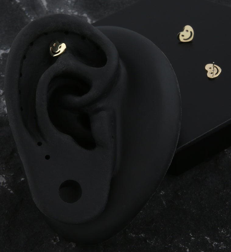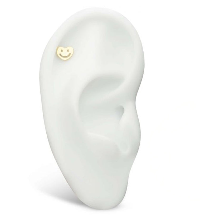 Threadless top piece that has a smiling heart design. Fits all threadless posts. Made from 14kt nickel-free gold with a 316L stainless steel pin. Length is approximately 5mm. Top size: 6.6mm x 5.3mm. Sold individually (1pc, top only).