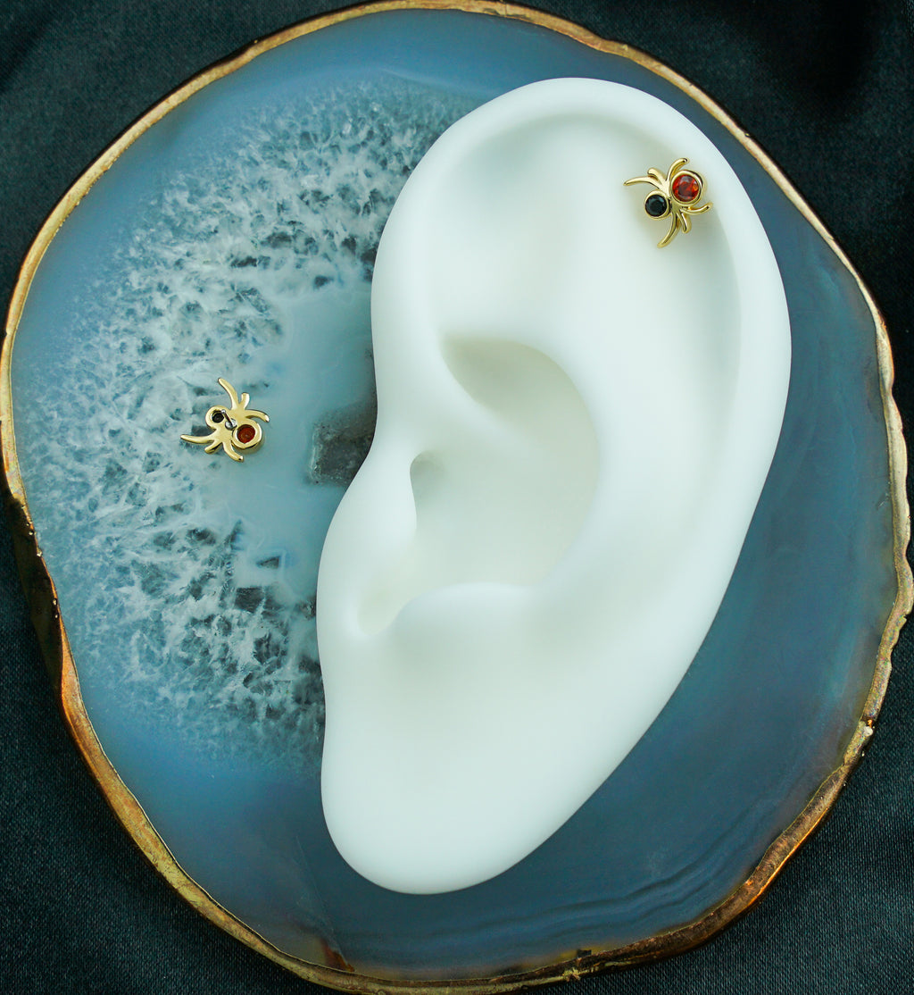 14kt nickel-free gold threadless top piece that has a spider design with a bezel black cz gem and a bezel red cz gem. Pin size is 25G and fits most threadless posts. The size is about 7mm x 7mm. Cute top to add to your cartilage or tragus piercing! Sold individually (top only).