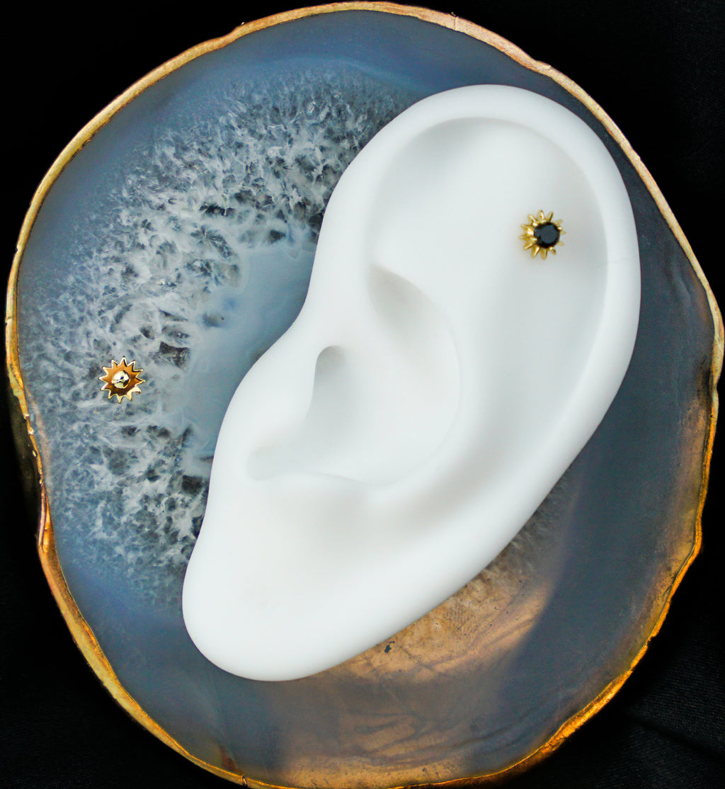 This threadless top piece has a spiky sun design with a black 4mm cz gem in the center. The whole design measures about 5.8mm x 5.8mm. This jewelry piece is made from 14kt nickel-free gold with a 316LVM ASTM F-138 5mm stainless steel pin. Sun-inspired choice for a variety of ear piercings! Sold individually (top only).
