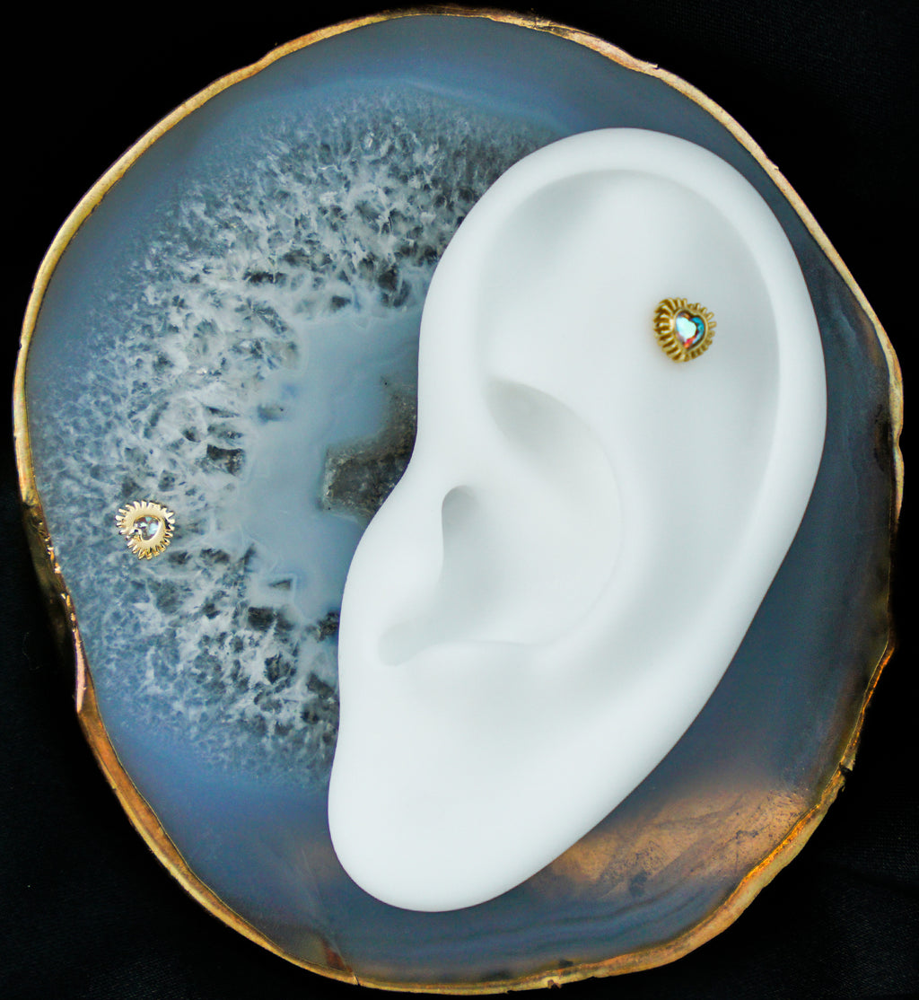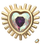 This threadless top piece has a spiked design that has a 4mm heart-shaped, rainbow aurora cz gem in the center. The design measures about 6mm x 5.6mm. This jewelry piece is made with 14kt nickel-free gold with a 316LVM ASTM F-138 5mm stainless steel pin. Colorful jewelry piece for a variety of ear piercings! Sold individually.