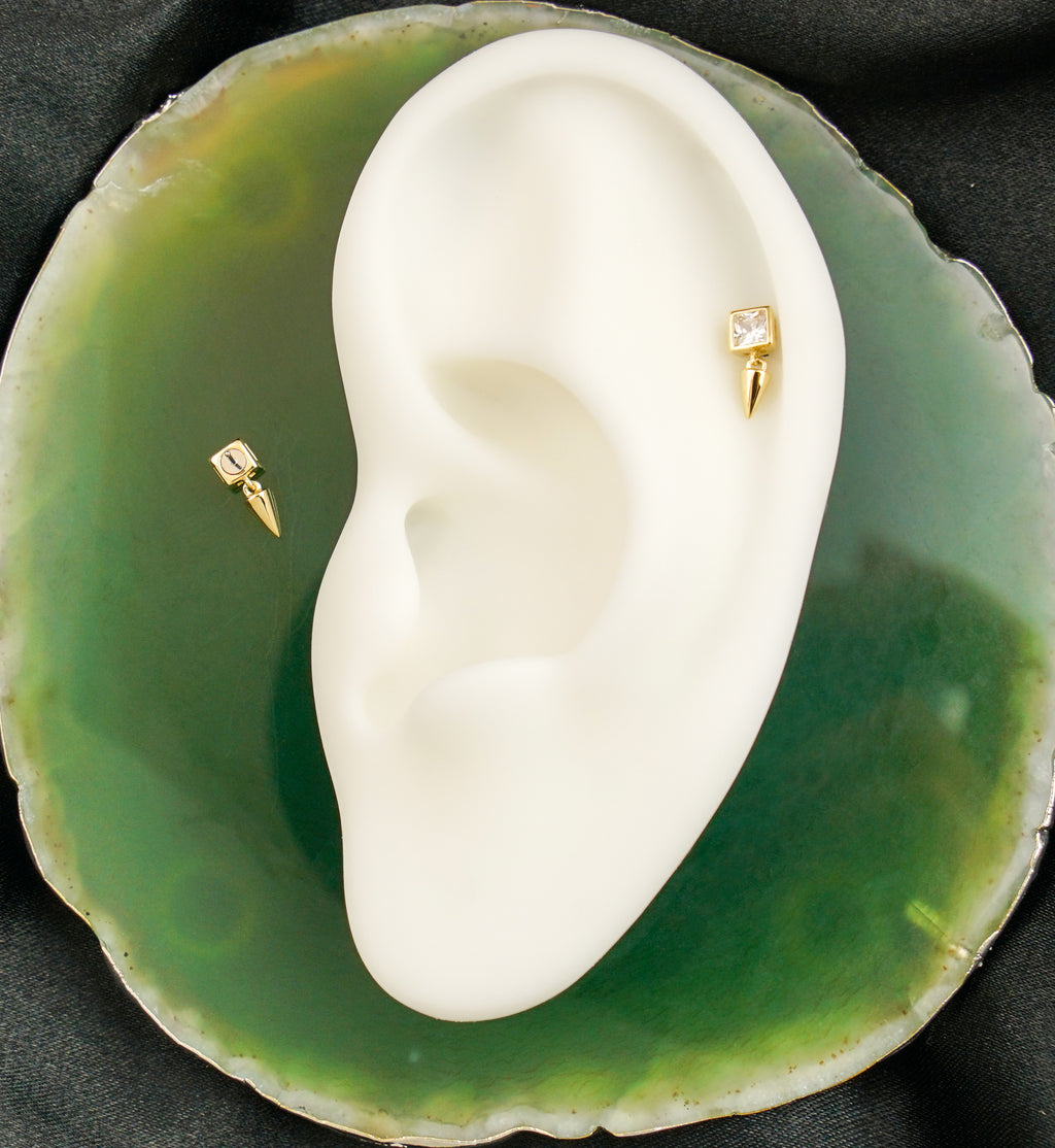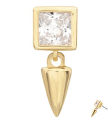 Threadless top piece that has a square, bezel set, 4mm clear cz gem on top that has an attached, dangling cone that measures about 4mm in length. Made from 14kt nickel-free gold with a 316L stainless steel pin. Pin size is 25G. Length is approximately 5mm. Top size measures at 8.7mm x 3.4mm. Sold individually (1pc-top only).
