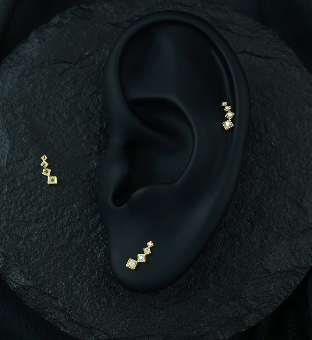 Bursting with rainbow aurora cz gems that flash every color of the spectrum, this dazzling piece turns your cartilage or tragus into a colorful light show! Made from nickel-free gold with a 316L stainless steel pin. Measuring at 9mm x 4.8mm with a 5mm total length and 25G pin, this piece is sure to be a fun addition to your jewelry collection!