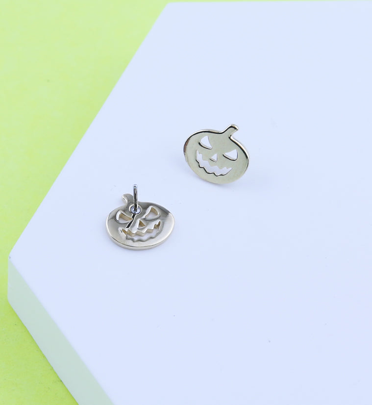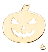 Spooky threadless top piece that has a scary, smiling pumpkin design. Fits all threadless posts. Made from 14kt nickel-free gold with a 316LVM ASTM F-138 implant grade steel pin. Length is approximately 5mm. Top size measures about 7.4mm x 6.7mm. Sold individually (1pc, top only).